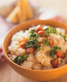(4)放入电饭锅中煮熟,开关跳起后,再焖20分钟,最后洒上巴西里粉,用饭匙轻轻拌匀即可。
