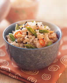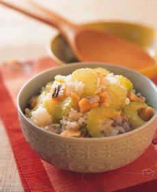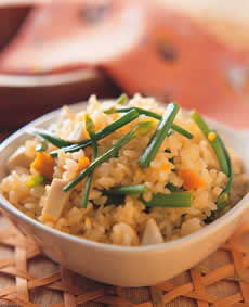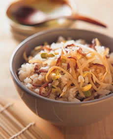 (2)将米洗净,沥干水分,加入2杯水浸泡15~20分钟,再加入调味料、姜丝、辣椒略拌匀,放入电饭锅中煮熟,开关跳起后,还要再焖15分钟,才能把盖子打开。