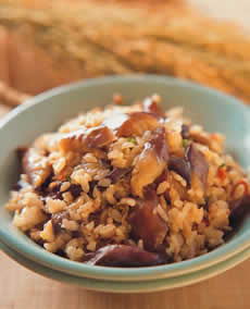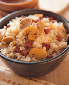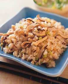 (3)将调味料加入米中略拌匀,再将玉蕈铺在米上,放入电饭锅中煮熟,煮好后焖15分钟,再用饭匙由下往上轻轻拌匀。