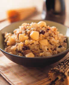 (3)将蒜头、猪肉丁均匀铺在八宝米上,一起煮熟,煮好后再焖15~20分钟,最后用饭匙由下往上轻轻拌匀即可。