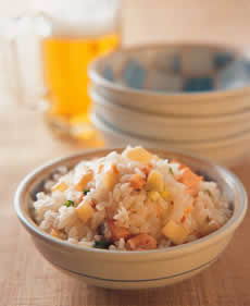 (3)开关跳起后先不要打开锅盖,让饭焖约15~20分钟左右,然后打开锅盖,加入调味料B再用饭匙由下往上搅拌均匀即可。