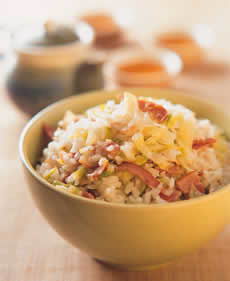 (3)将调味料放入米中略拌匀,再将高丽菜及培根条铺在上,放入电饭锅中煮熟,开关跳起后,先不要打开锅盖,让高丽菜饭再焖15分钟,最后用饭匙由下往上轻轻拌匀即可。