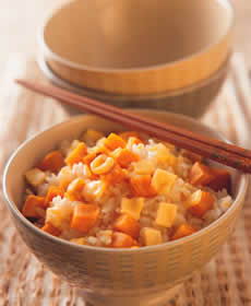 (3)将地瓜丁、油加入米中,稍微拌一下。