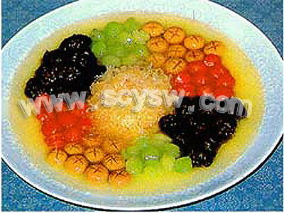 1、银耳泡开去黄根,加清汤煮1小时;发菜加清汤煮10分钟;胡萝卜、莴笋去皮,削成鲜蘑状,放入沸水煮沸取出;