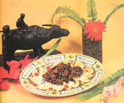 (2)锅里加入生油,至八成热,投入串好的牛肉,炸至熟后,捞起装盘即成。