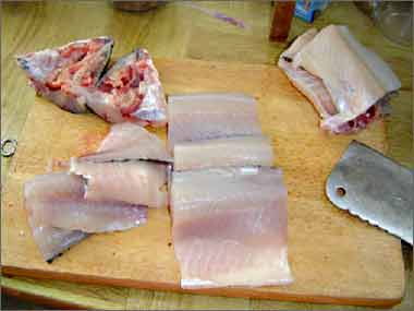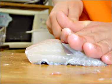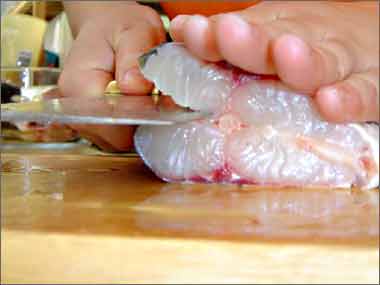 5、用手压住鱼段,另一手拿刀贴住鱼脊骨上沿推近,感觉着鱼骨的位置,及时调整行刀的方向...切不好的话多买几条鱼练习先:)