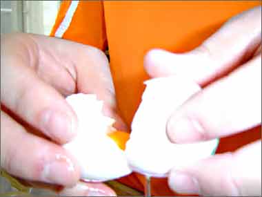 8、取一个鸡蛋,左右手倒一倒,倒出蛋清备用