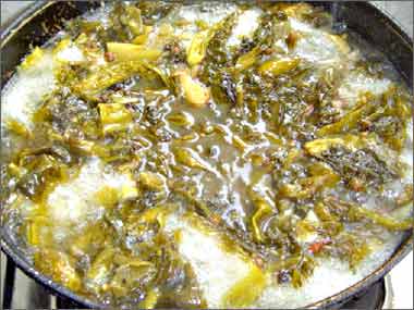 12、锅中放油烧热,最好是大油,不过为了......还是用普通的油做吧!倒入切好的酸菜翻炒 ………………然后加入水或者高汤烧开