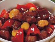 3. 再放少许油,油至三成热,将葱白放入锅中煸出香味捞出,倒入栗子和肉块,放红椒、料酒、糖、酱油、清汤,待汤沸倒入鸡精、水淀粉、香油装盘即可。
