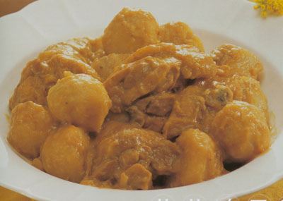 1、鸡腿剁小块,拌入调味料1略腌,然后过油捞出。