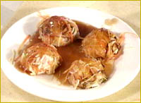 2、用虾胶挤成鸡蛋大小的球,并在表面上粘满干贝丝,香菇丝、火腿丝,装盘上笼用沸水大火蒸25分钟取出;