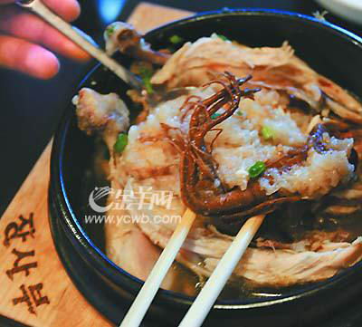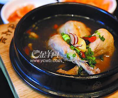 对于以前没有吃惯参鸡汤的顾客,厨师会推荐他们尝一尝“药参鸡汤”,这是最基本的菜式,也是鸡肉与人参合理调制而成的,完全没有鸡油,吃起来也就没有油腻感,符合广州人的饮食习惯。老板还透露了一点制作诀窍,必须选用口感上好的童子鸡,从尾部挤出内脏、洗净,再塞进糯米、红枣、栗子等原材料,保持鸡身的完整不破裂,在汤中加入人参、黄芪、川弓、大蒜等配料后长时间炖煮至熟。炖汤的容器是韩国典型的石锅,上桌之后热气腾腾、肉香扑鼻,可根据个人口味边吃肉边加盐、胡椒粉和辣酱,而且还必须将肉汤喝完,要不就浪费了整锅汤的精华。