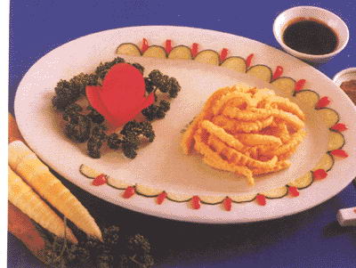 1.小竹笋去壳、除根,直剖成6条,入冷水浸泡1小时,使之弯曲成凤尾形;取出后放葱姜汁、盐和味精拌匀,拖上蛋液,拍上淀粉。