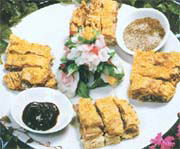 烹调方法:煎。鸡蛋打入碗内调散,加入水芡粉,面粉及适量盐调成糊,放入鸭块和匀,在大平盘内摊成饼状,锅内加入猪油烧热,将摊成饼状的鸭状放入锅中,用小火反复煎至两面呈金黄色,起锅滤油,再改成骨排块、摆装在盘中,撒上椒盐、麻油即成。