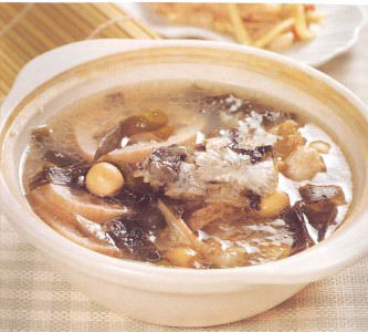 材料: 莲藕100克、海带(江白菜)150克、莲子5克、姜5 片、新鲜鱼头100克、鸡汤适量、小米粉1匙、米酒3匙,酒、姜汁各1匙,胡椒粉、食盐适量。