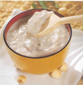 3. 牛奶煮沸时慢慢将莲子糊倒人,混和均匀,煮熟即可。