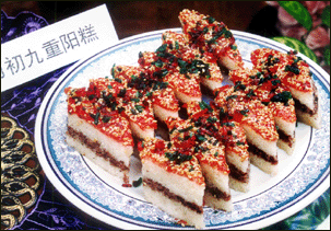 糕在汉语中谐音“高”,糕是生长、向上、进步、高升的象征。宋代民俗,在九月九日天亮时,“以片糕搭儿女头额,更祝曰:愿儿百事俱高。作三声”(吕原明《岁时杂记》)。糕不仅谐音“高”,而且重阳糕上的诸种饰物也都有着各自的寓意。如糕上置小鹿,称为食禄糕。糕上的枣、栗、狮子之类饰品,都是中国传统的祈子象征物,它们明白地表示着人们在秋收时节祈求子嗣的愿望。重阳还是出嫁的女儿回家的日子,接出嫁女儿回家吃重阳糕,是重阳的另一节俗,俗谚有“九月九,搬回闺女息息手。”所以重阳如端午一样,被称为“女儿节”。