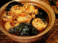 制作过程: 1、将猪肉切成米粒状,加葱,姜,水,精盐,料酒,干淀粉搅拌上劲,菜头剖成十子刀纹,在油锅中煸至翠绿色,加精盐,猪肉汤烧沸; 2、取一砂锅用熟猪油抹锅底,将菜心排入,倒入肉汤,在火上烧沸,将拌好的肉分成几份,做成光滑肉圆,放在菜心上,上盖青菜叶,加锅盖,烧沸后移至微火焖两小时即可。