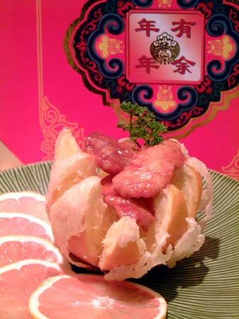 5.在6个餐盘内舀入米饭。在每盘的米饭上放上葡萄柚和橘子片,再放上一片鸡肉。在鸡肉和果肉上浇上沙司。以葱花点缀。如需要,可以葱末装饰。