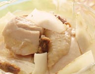 2.玉竹以清水快速冲净,和鸡块、人参片一道放进炖锅内,加调味料和4碗水,并以保鲜膜覆盖住锅口。