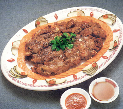做 法: 1、先将鲜蚝仔用清水漂洗干净,用雪粉水调匀,并将葱头切成细粒放入,同时加入味精、鱼露搅匀待用。2、用旺火烧热平鼎有足够热度后,加入少许猪油,将蚝仔、粉水混和成浆状,用匙再调和后下鼎,再把鸭蛋去壳打散淋在上面,加入猪油煎,并配入辣椒酱调味,用铁勺在鼎里把蚝烙切断分块,再用勺翻转,四周加入猪油,继续煎烙,煎至上下两面酥脆,并呈金黄色,盛入盘即成,并伴上芫荽叶。