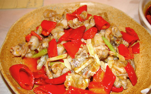 重庆江湖菜中,以泡椒为调料的颇多,而泡椒牛蛙最常见又易烹制,成菜后味咸鲜,肉细嫩,色红亮,泡菜香气浓郁。
