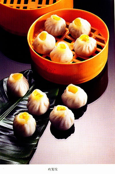 3、将饺皮放上馅料,包拢,提成鸡笼样状,饺口放上火腿末,入蒸笼蒸熟取出。上席时淋上熟猪油。跟上香醋2碟。