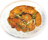 4、在镬中放下1汤匙油,爆香姜丝,下芡煮滚,放下鸡块炒匀上碟,放下葱丝。