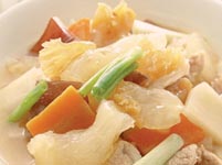 3.将作法2的材料盛入沙锅内,水加至淹没材料,以大火烧沸后,改小火慢炖20分钟左右,即可。