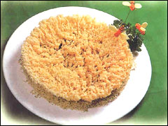 4、待锅中“蜂窝”炸至成形酥脆时,捞出沥净油,稍后再将“蜂窝”移入圆盘内,撒上白糖即成。