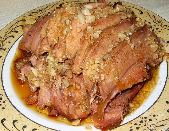 清真酱牛肉色泽酱红,油润光亮。切片后保持完整不散,切面呈豆沙色,肌肉中的少量牛筋色黄而透明。食之咸淡适中,酥嫩爽口,是人们餐桌上理想的美味佳肴。