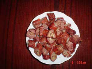 也是店里的招牌菜之一,有点类似以前吃过的“泼辣鱼”,轻轻拨开上面的辣椒,捞起一块鱼片,滴去些油,先添尝一小口,顿感这青鱼片香滑无比,嫩却不碎,然后辣味开始渐渐在舌尖较劲起来,却掩盖不过它的鲜。这道菜居然是蒸出来的,而由二三十种调料配成的“秘方汤”则是这鱼的鲜辣劲更胜一筹,让人欲罢不能。