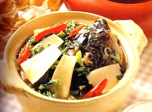 鲢鱼头半个,雪里蕻110克,肉馅75克,冬笋1根,豆腐1长块,葱2根,辣椒1个。休 闲 居 编 辑
