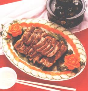 2、 将川椒粒下炒鼎炒香盛起,与八角、桂皮、甘草、丁香同放在卫生纱布中包扎成球,放进卤水盆里,加入酱油、色油、冰糖、南姜、香茅、白酒,并把肥猪肉用刀切开成块放下,再加入清水,以中火把卤水烧沸;将大蒜、芫荽头、南姜放入光鹅腹内(卤熟时取掉),再把鹅放入卤水盆里,大约煮1小时30分钟(中间要将卤鹅吊起离汤后再放下,反复四次)并注意把鹅身翻转数次,使其入味,然后捞起放晾待用。 3、 把熟卤鹅放在砧板上切成厚片,淋上卤汁(加入味精),使之湿润即成。上席时跟上蒜头醋2碟。