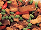 (4)烧热3汤匙油,一次下鸡肉、毛豆、红椒轻轻炒匀,至鸡肉变色时取出。