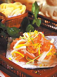 做法:将三文鱼用红椒、花椒、盐、洋葱、青蒜、胡椒等料腌12小时,切片备用。把青萝卜丝用水冲透,放入烤好的盏中,把三文鱼放在上面,吃三文鱼时有淡淡的清凉感,将制作好的食品放到一个石器做的成器上,汁酱用古式器皿盛上。(文/记者麦晓颖 黄晓蕴 图/记者麦晓颖)