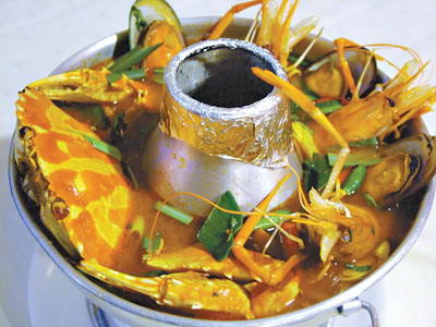点评:冬阴功汤可以说是最著名的泰国菜之一,说到底就是酸辣虾汤,汤的材料包括甘草、柠檬、冬葱、胡椒、鱼露等,再配上各种海鲜,由一个金鼎炭炉奉上,感觉相当隆重。细尝时,一股奇香怪辣味冲上脑门,再三品尝,原来酸辣之外还有点海鲜的甜味,透着一丝鲜香。不到一会儿,已经渗出微汗来,如是说来,这个季节喝一碗又酸又辣的冬阴功汤实在是开胃的好享受。