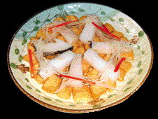银鳕鱼200克,荷塘冲菜30克,豆卜50克,姜丝、葱花、调味料适量。 休 闲 居编 辑