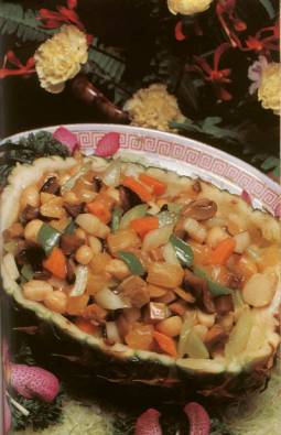 3、 炒香果仁和菠萝肉粒,加入全部杂菜粒炒匀,装进似船形的菠萝壳内即成。