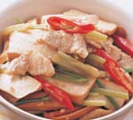 2 用2大匙油爆炒五花肉,肉色变白时放入豆干和蒜末炒香,然后加入所有调味料,最后加入芹菜、辣椒,炒熟即盛出。