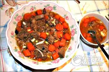 又煮了很长时间以后,这时候牛肉马上就熟了,把胡罗卜块到进去同煮,这时候在放盐,提前放盐,牛肉会紧缩,不容易熟