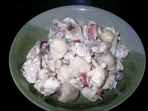 鸡腿切块、飞水,水里放几片姜,这个是飞过水的鸡腿快