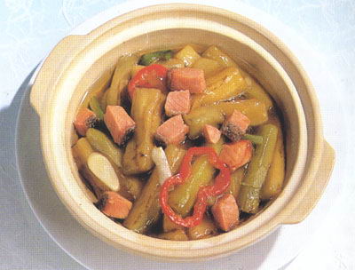 [原料]咸马哈鱼肉100克,茄子400克、毛豆仁3克,汤100克。