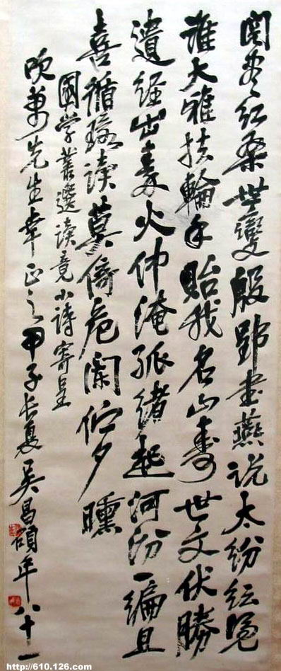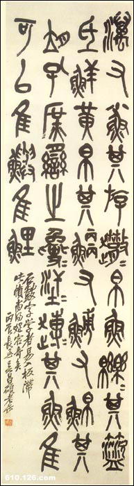 清末著名书画家,篆刻家。原名俊卿,字昌硕,别号苦铁,浙江安吉人。少年时他因受其父熏陶,即喜作书,印刻。他的楷书,始学颜鲁公,继学钟元常;隶书学汉石刻;篆学石鼓文,用笔之法初受邓石如,赵之谦等人影响,以后在临写《石鼓》中融汇变通。沙孟海评:吴先生极力避免“侧媚取势”,“捧心龋齿”的状态,把三种钟鼎陶器文字的体势,杂揉其间,所以比赵之谦高明的多。吴昌硕的行书,得黄庭坚、王铎笔势之欹侧,黄道周之章法,个中又受北碑书风及篆籀用笔之影响,大起大落,遒润峻险。