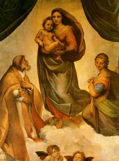 拉斐尔:(1483——1520)是文艺复兴意大利艺坛三杰之一,他父亲是宫廷的二级画师。他从小随父学画,七岁丧母,十一岁丧父,进画家画室当助手。学习了十五世纪佛罗伦萨艺术家的作品,走上了独创的道路。从二十二岁到二十五岁创作了大量圣母像,从此声名大扬。他没有达芬奇那样经验丰富博学深思,也没有米开朗基罗 的雄强伟健的英雄气概。可是他虽然只活了三十七岁,却成为文艺复兴盛期最红的画家。他的风格代表了当时人们最崇尚的审美趣味。他是个绝顶聪明的人,他的聪明特别表现在善于汲取他人之长,而后加以综合的创造。他一生创作了不少作品, 其中《大公的圣母》和《教皇利奥十世》等,还作了一些建筑设计,并为西斯廷小教堂设计画稿。他的才能又表现在他创造出最合乎当时人们的口味的形象,风格被特称为一种“秀美”的风格,不仅使当时人倾倒,并且延续了四百年之久,成为后世古典主义者认为不可企及的典范。
