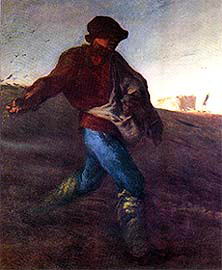 米勒(Jean-Francois millet 1814- 1875)法国画家。1814年10月出生于诺曼底半岛格鲁什村的一个耕农家,1875年1月卒于巴比松。他自幼参加田间劳动。18岁来到瑟堡师从当地画家学习,23岁获得瑟堡市议会的奖学金,赴跟随罗拉罗什学画,但更吸引他的是卢佛尔宫中的名画。他从米开朗基罗和普桑的画中学习的宏伟的纪念碑式的形式和气派,从伦勃朗和夏尔丹的画中学习到富有平民生活气息的内容和表现技巧。米勒于1849年夏到巴比松村定居,但枫丹白露森林的景色却不是他画布上的主要内容,他的主要描绘对象是法国农村的劳动者。米勒从来没有画过农民反抗的场面,这也许是由于他的温厚的人道精神中含有宗教情绪的缘故。但他画的胼手胝足,粗衣陋食的劳动者的形象,实际上对纸醉金迷,灯红酒绿的上流社会就是一种抗争,虽然这种抗争是较温和的。1850年的这幅《播种者》即是如此。这是一个深沉有力的劳动者的形象。身躯高大的农民身著红衫蓝裤,在田野上播种。这幅画招到了"高等市民"的不安,他们在播种者那充满韵律感和强有力的动作中看到了类似六月革命时巴黎街头人民的形象。但当时的进步人士却有不同的反映。作家雨果从这幅画中看到对人民创造力量的赞美,因而予以充分的肯定。米勒用一种雕塑般的单纯而简练的形象,概括地表达耐人寻味的内容,所以荷兰画家梵高评述说:“在米勒的作品中,现实的形象同时具有象征的意义。”