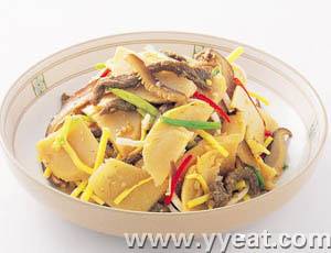 (5)在炒的肉里放香菇﹑石耳﹑青椒炒后﹐放在冲白面的水里煮熟﹐并与炒好的竹笋混在一起盛在碗里。休 闲 居 编 辑