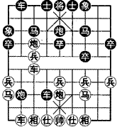 如图形势,经方杨官?U已一兵渡河,双车已经出动,但由于马炮被对方所牵制,一时难有攻击手段。红方采用了兑子争先的战术,终于取得了优势。红方先行: