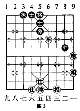 如图3,黑方虽士象在一边,但黑车没能守肋占将门,因此,红方有巧胜的机会。取胜要点:用帅助战,通黑车返回底线防守,再架中炮,破去黑象。