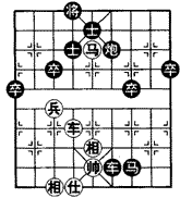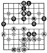1983年全国团体赛广东蔡福如对黑龙江王嘉良,两人一个是棋坛小霸王,一个是弈林东北虎,双方以半途列炮布阵,激战至第对个回合形势如图。红方车炮分捉、瞄黑马,黑如逃中马则红车杀象有强大攻势。面对险情,黑方经过慎密思考,巧施“美人计”,运马弃马,紧握战机,马